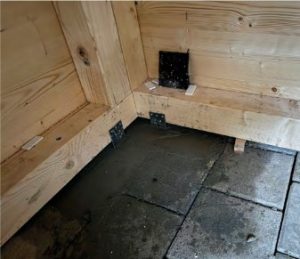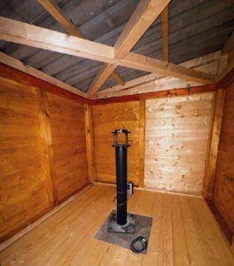Abb.2: Kurze Balkenstummel außerhalb der Hütte in Verbindung mit jeweils einer weiteren Laufschiene an der Balkenunterseite und einer Stützrolle konnten das Problem des Kippens des abgefahrenen Daches beheben