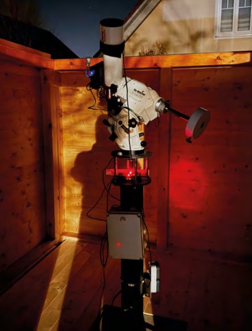 Vielleicht wird der ein oder andere Leser dazu inspiriert, auch eine eigene kleine Sternwarte zu bauen. Die Vorteile eines immer einsatzbereiten Teleskops sind enorm und können das Hobby Astronomie auf ein neues Level bringen. Als verhältnismäßig günstiger Schutzbau wurde die Fahrradgarage StoreMax 190 von der österreichischen Fa. Biohort ausgewählt [1]. Diese ist mit einem Verkaufspreis von ca. 1.600 € (Stand: Juli 2024) im Vergleich zu anderen Schutzbauten mit ähnlichem Funktionsumfang relativ kostengünstig. Das Schwierigkeitslevel für das Fundament, den Aufbau und diverse Umbauten zur Sternwarte ist als eher gering anzusehen, so dass dieses Bauprojekt auch Personen mit wenig handwerklichem Geschick empfohlen werden kann. Von dieser Fahrradgarage der Serie StoreMax gibt es drei Größenausführungen. Das Modell: StoreMax 190 ist die größte Variante. Diese kann ein C11-Schmidt-Cassegrain-Teleskop beherbergen und ist mit ihren Maßen von L = 190 cm, B = 97 cm und H = 136 cm sehr platzsparend in den Garten oder Balkon integrierbar. Die zwei Rollladenschiebetüren ermöglichen die komplette Öffnung der gesamten Frontseite der Fahrradgarage vom Horizont bis über den Zenit. Beobachtungen bis in den Zenit sind dadurch möglich (Abb. 2). Durch die niedrige Bauhöhe von weniger als 140 cm entfällt in der Regel eine Bewilligungspflicht, was aber je nach Gemeinde unterschiedlich gehandhabt wird. Man kann sich die Fahrradgarage somit in seinen Garten stellen, ohne die Zustimmung von Nachbarn und Gemeinde einholen zu müssen. Nachdem ein geeigneter Platz im Garten gefunden war, wurde das Fundament für die Sternwarte errichtet. Hierzu wurde die Erde mittels Hacke und Schaufel ca. 10 cm tief abgegraben und per Erdstampfer verdichtet. Anschließend wurde ein Bodenflies eingelegt, um Unkraut und Wurzeln am Durchwachsen zu hindern. Danach wurde eine ca. 6 cm dicke feine Kiesschicht aufgetragen, mittels Abziehleiste und Wasserwaage gleichmäßig verteilt und mit dem Erdstampfer verdichtet. 4 cm dicke Terrassenplatten, lückenlos zueinander aufgelegt, bilden den Boden der Sternwarte (Abb. 3). Auf das fertige Fundament wurde in ca. 3-stündiger Arbeitszeit die Fahrradgarage aufgestellt. Durch deren großes Gewicht konnte auf eine zusätzliche Sicherung am Fundament verzichtet werden Für die Stromversorgung wurde eine runde Öffnung in ein Seitenteil des Gehäuses gestanzt. Eine wasserdichte Kabeldurchführung und ein Stück Gartenschlauch dienen als Schutz für das eingeführte Stromkabel in das Innere der Sternwarte (Abb. 4). Eine Funksteckdose beim Hausanschluss ermöglicht eine bequeme Stromlosschaltung bei Nichtbenutzung der Sternwarte. Die Netzwerk- und Internetverbindung erfolgt über PowerLAN-Adapter (Internet über die Steckdose). Der PowerLAN-Adapter für die Sternwarte ist in der grünen Verteilerbox eingesteckt (Abb. 5). Der zweite Adapter befindet sich im Wohnzimmer beim Internet-Router. Dadurch kann von der Wohnung aus per Remotebetrieb auf die Sternwarte zugegriffen werden. Der Zugriff kann auch per Laptop über WLAN erfolgen. Unter der grünen Verteilerbox befindet sich ein PC. An diesem ist das gesamte Teleskopequipment angeschlossen und die kostenlose Remotesoftware „UltraVNC“ als Server installiert. Auf dem Laptop, über welchen die Sternwarte gesteuert wird, ist UltraVNC als Client installiert. Die Remoteverbindung funktioniert so gut, dass eine verlustfreie Bildqualität und kein nennenswerter Eingabe-Delay vorliegt. Das BIOS des Sternwarten-PCs wurde so konfiguriert, dass der PC bei Stromzuschaltung via Funksteckdose automatisch hochfährt. Auch alle für die Beobachtungsnacht relevanten Programme werden nach dem Booten über die vorkonfigurierte Windowsfunktion „autorun“ automatisch gestartet und initialisiert. Unter dem PC befindet sich eine selbstgebaute PowerBox [2]. In dieser sind alle Netzteile und EDV-Module untergebracht sowie das Kabelwirrwarr versteckt. Für den Betrieb der Sternwarte sind in Summe 10 Netzteile erforderlich. Würden alle bei Stromzuschaltung gleichzeitig Strom bekommen, käme dies einem Kurzschluss gleich und die 16A-Sicherung würde auslösen. Daher befinden sich in der grünen Verteilerbox zwei weitere Funksteckdosen, um die Stromzufuhr der Netzteile und des PCs in drei Etappen langsam zuschalten zu können. Des Weiteren beinhaltet die PowerBox einen Taukappenheizkontroller, einen USB3.0-Hub, einen 12V-Ausgang für den Anschluss einer Flatfieldbox, eine 230V-Steckdose, um mittels Staubsauger die Sternwarte reinigen zu können, ebenso zwei USB-Ladeausgänge, um technische Geräte im Freien aufladen zu können. Eine IP-Kamera erleichtert den Remotebetrieb (Abb. 6). Diese kann remote per Mausklick in alle Richtungen geschwenkt werden. Im Nachtsichtmodus (IR-LEDs) lassen sich außerdem die Schwenkbewegungen des Teleskops verfolgen, der Garten überwachen und ein schneller Übersichtsblick vom Nachthimmel gewinnen. Die Erdung der Fahrradgarage erfolgt über ein Kabel, welches per Steckdosen Erdungsadapter mit der Stromleitung verbunden ist. Im rechten Seitenbereich der Sternwarte befindet sich eine von einem Kugelkopf gehaltene Kunststoffbox, in welche im Eigenbau eine Meteo(r)-Station ein gebaut wurde [3]. Diese beinhaltet ein Sky Quality Meter zur Aufzeichnung der Himmelshelligkeit im Verlauf der Beobachtungsnacht sowie eine AllSky-Kamera zur Remote-Begutachtung der Beschaffenheit des Nachthimmels oder – via Analysesoft- ware – zur automatischen Dokumentation von Meteoren und anderen Leuchterscheinungen am Nachthimmel, als Videobeweis mit Zeitstempel. Ein Mikrofon soll das von der Wissenschaft noch nicht vollständig verstandene Phänomen der Synchronschallereignisse bei großen Meteoren bzw. Meteoriten mit Zeitstempel erfassen. Ein Sensorfühler dokumentiert die vorherrschende Temperatur, Luftfeuchtigkeit und den Taupunkt während der Beobachtungsnacht in Diagrammdarstellung. Um den Temperaturunterschied in der Fahrradgarage zur